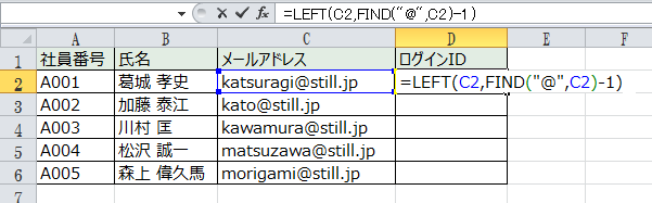 1.D2セルに下図のようなFIND関数とLEFT関数を入力します。