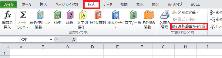 範囲選択し、[数式]タブの[選択範囲から作成]をクリックする。