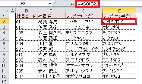 ASC関数、JIS関数を使用する。