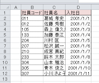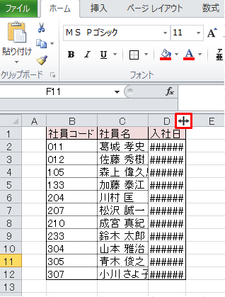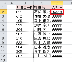 2.セルの列幅が広がり、入社日が表示されました。