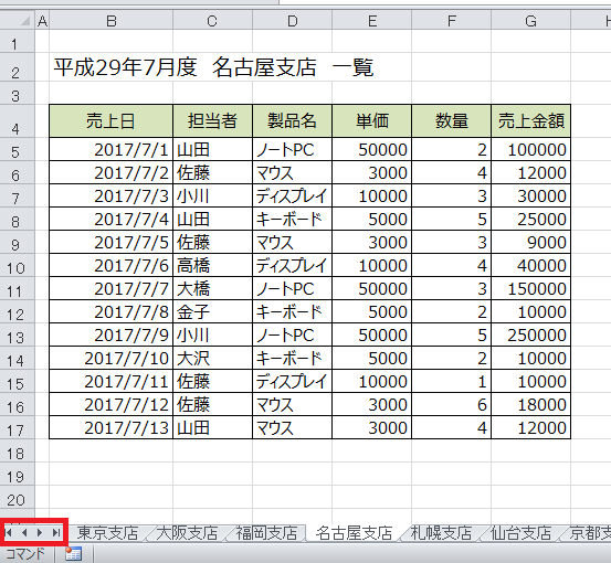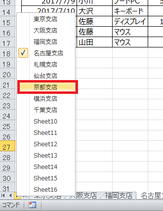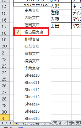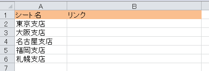 1.例として「シート名一覧」「東京支店」「大阪支店」「名古屋支店」「福岡支店」「札幌支店」シートがあるとします。