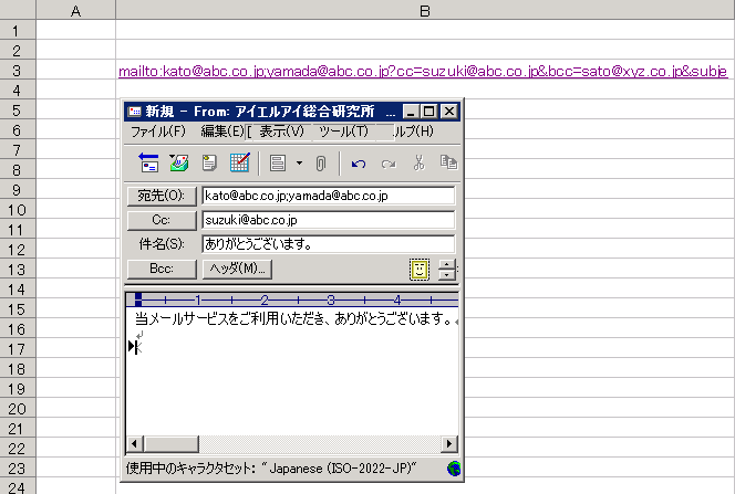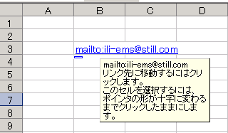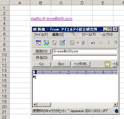 例えば、「mailto:ili-ems@still.co.jp」とすると、自動的にExcelのハイパーリンク機能が動作し、宛先が「ili-ems@still.co.jp」となった新規メールが立ち上がります。