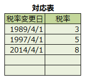 税率の変更日と税率の対応表を作成します。