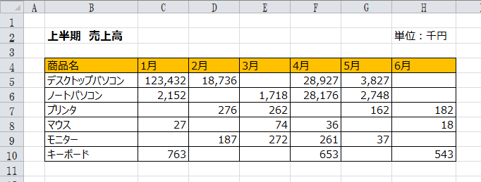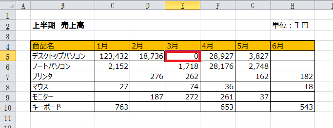 表内の選択した箇所全ての空欄に、0(ゼロ)が入力されました。