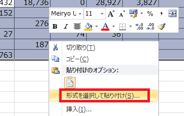 3.この状態で、右クリックから「形式を選択して貼り付け」を選択します。