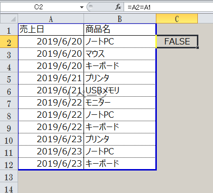 同じならTRUE、違えばFALSEとなる数式です。