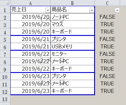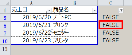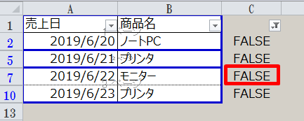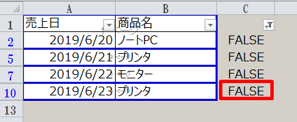 2.フィルタで「FALSE」のみ表示します。