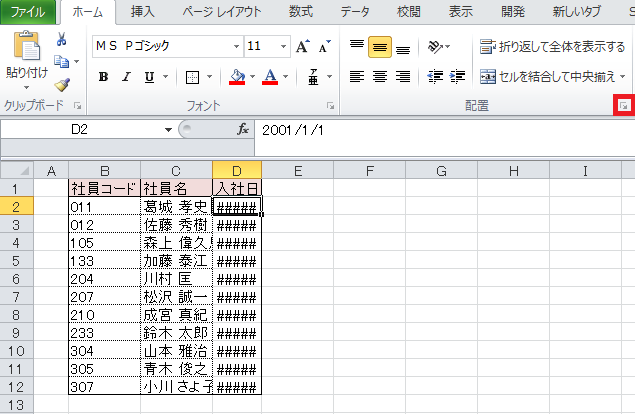 1.縮小したいセル(または列)は選択し、リボンの[配置]グループの右下にある矢印のアイコンをクリック。(例ではD2セルを選択しています)