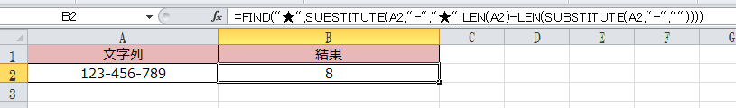 数式:=FIND("★",SUBSTITUTE(A2,"-","★",LEN(A2)-LEN(SUBSTITUTE(A2,"-",""))))