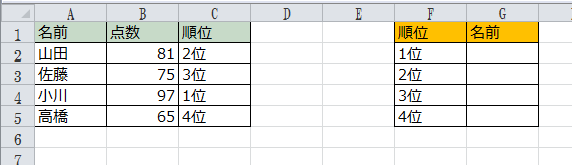 G4セル : =INDEX(A2:C5,MATCH(F4,C2:C5,0),1)